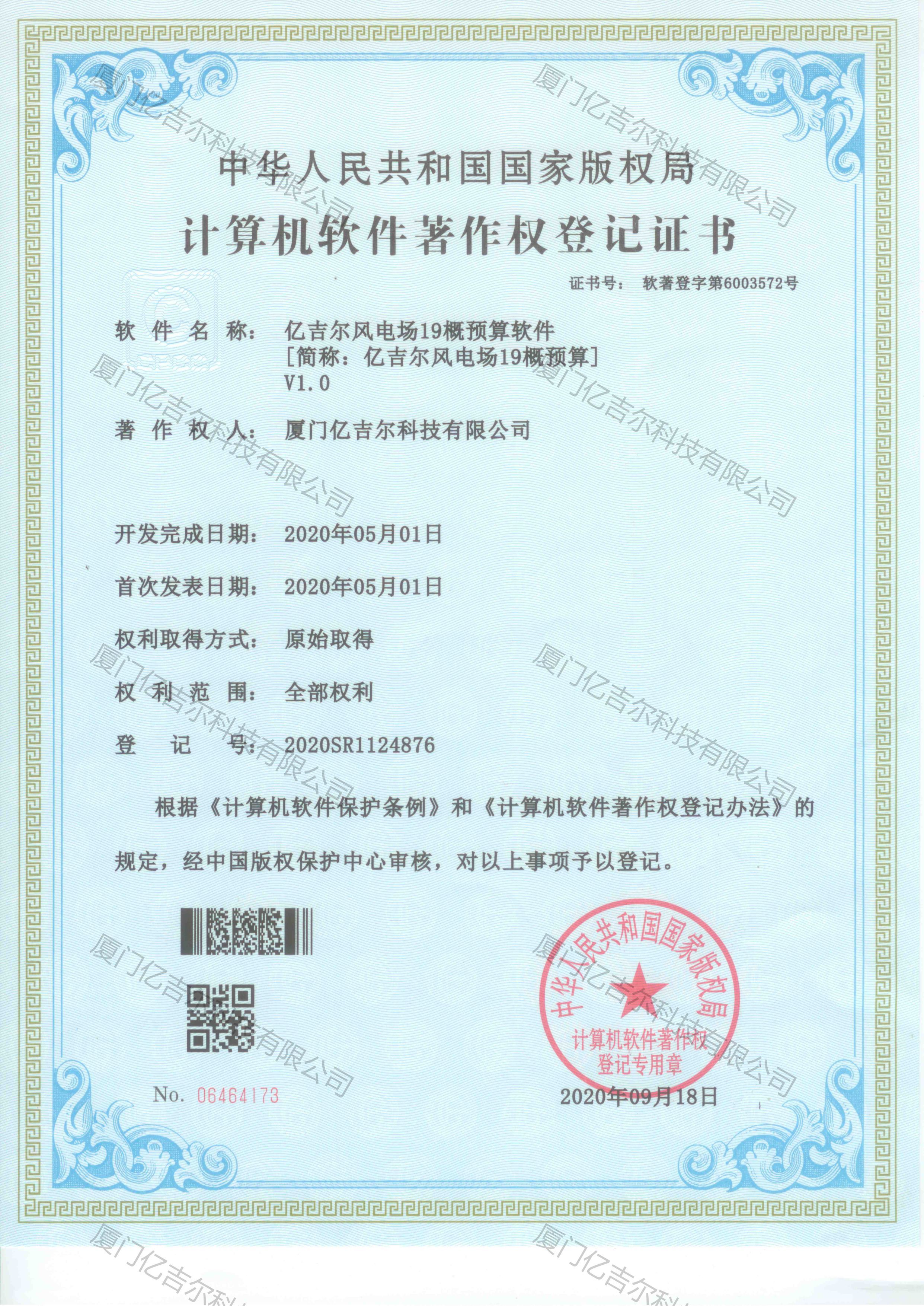 億吉爾風(fēng)電場(chǎng)19概預(yù)算軟件著作權(quán)登記證書 發(fā)布日期:2020年09月18日 瀏覽次數(shù):2421 關(guān)鍵字: 公司 1/1億吉爾風(fēng)電場(chǎng)19概預(yù)算軟件著作權(quán)登記證書