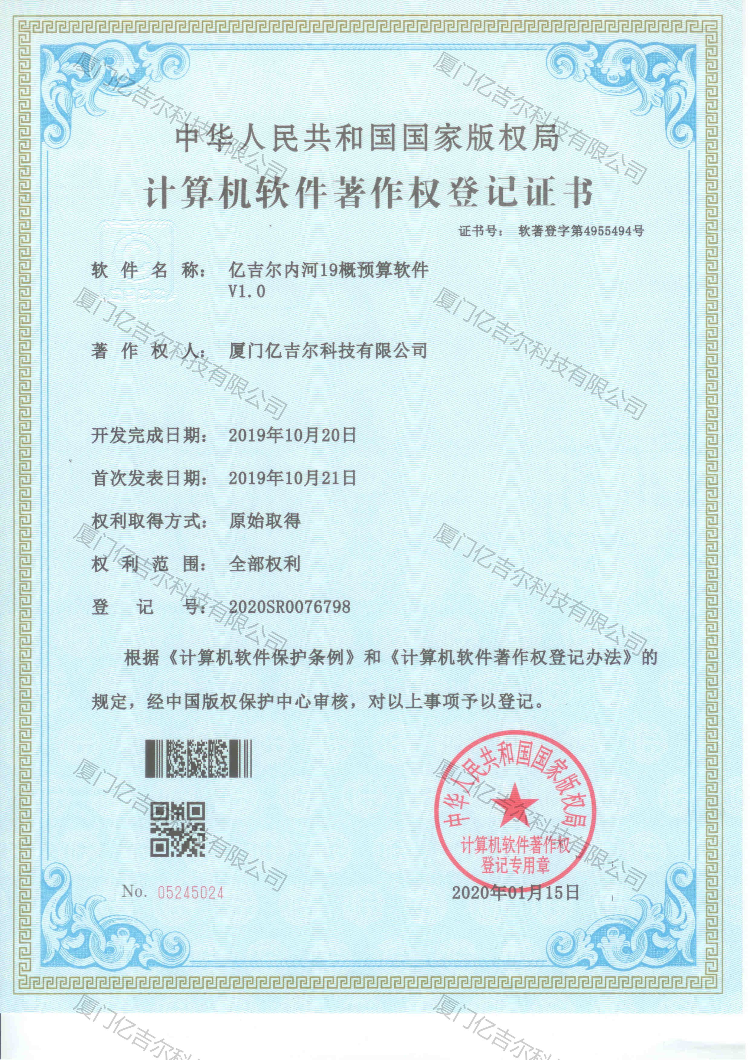 億吉爾內(nèi)河19概預(yù)算軟件著作權(quán)登記證書 發(fā)布日期:2020年01月15日 瀏覽次數(shù):2565 關(guān)鍵字: 公司 1/1億吉爾內(nèi)河19概預(yù)算軟件著作權(quán)登記證書