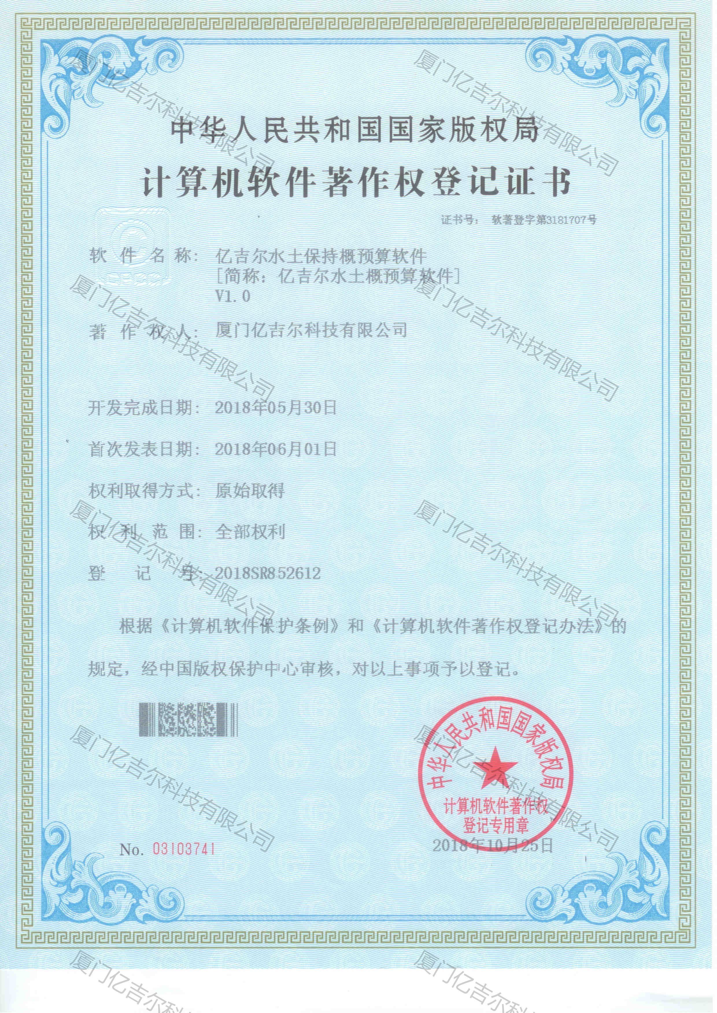 億吉爾水土保持概預(yù)算軟件著作權(quán)登記證書 發(fā)布日期:2018年10月25日 瀏覽次數(shù):2441 關(guān)鍵字: 公司 1/1億吉爾水土保持概預(yù)算軟件著作權(quán)登記證書