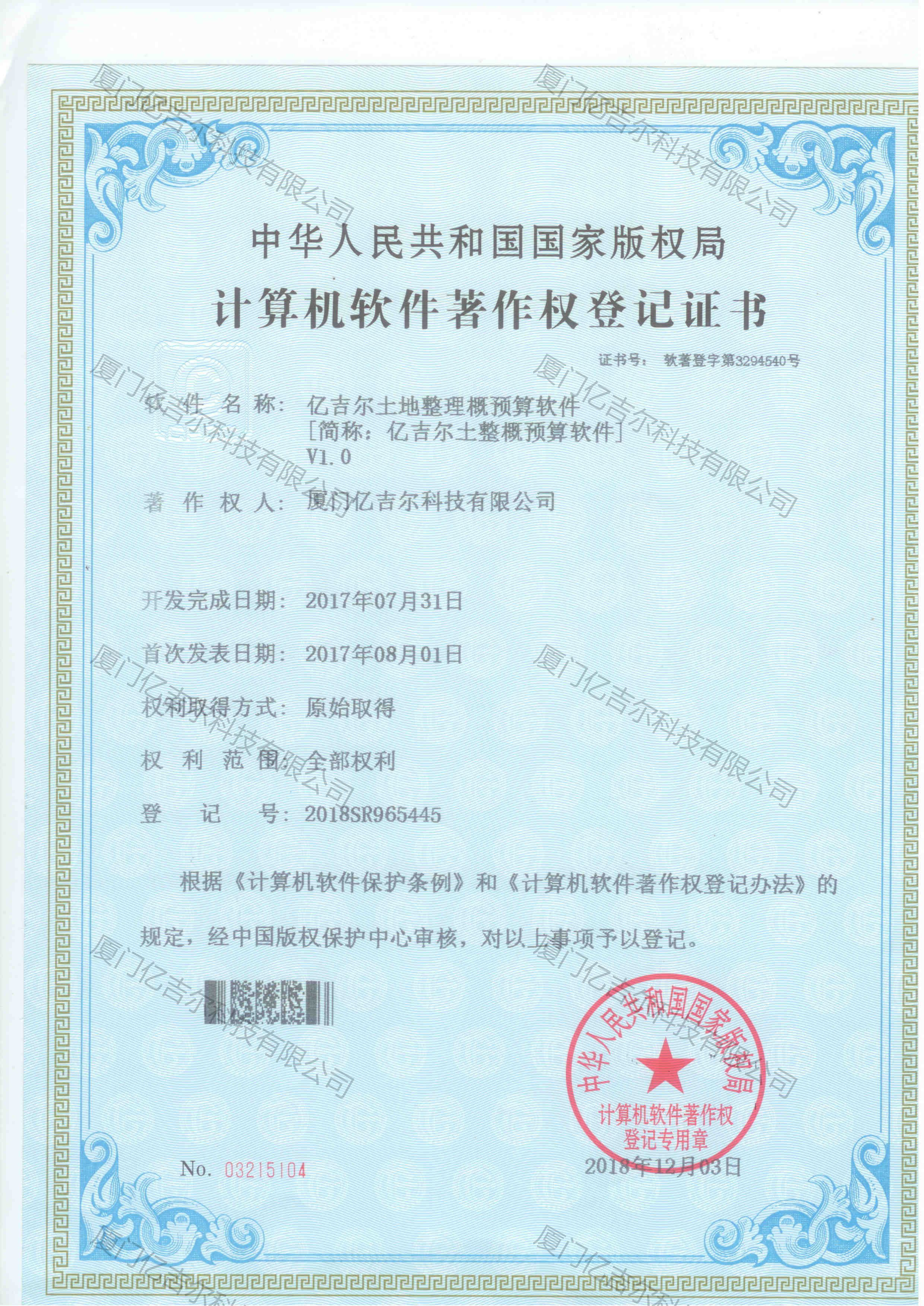 億吉爾土地整理概預(yù)算軟件著作權(quán)登記證書 發(fā)布日期:2018年12月03日 瀏覽次數(shù):2526 關(guān)鍵字: 公司 1/1億吉爾土地整理概預(yù)算軟件著作權(quán)登記證書