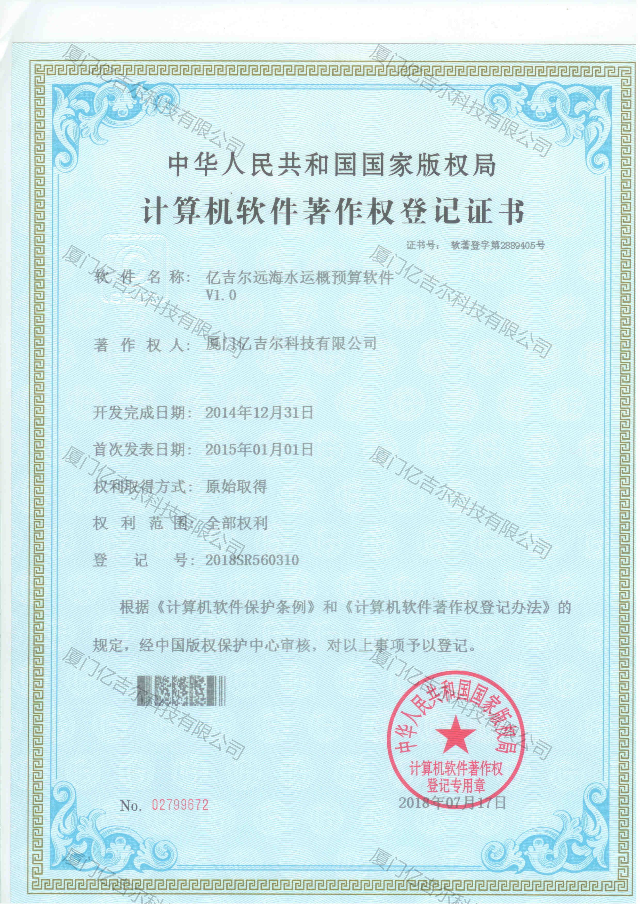 億吉爾遠(yuǎn)海水運(yùn)概預(yù)算軟件著作權(quán)登記證書 發(fā)布日期:2018年07月17日 瀏覽次數(shù):2356 關(guān)鍵字: 公司 1/1億吉爾遠(yuǎn)海水運(yùn)概預(yù)算軟件著作權(quán)登記證書